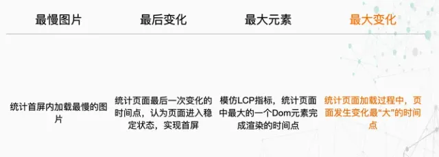 - 最大变化: 在之前只通过大小一个维度来描述首屏的基础上,又衍生出了,计算最大的一次变化,通过层级、标签权重、元素面积等因素,通过计分的方式,记录下最大的一次变化。